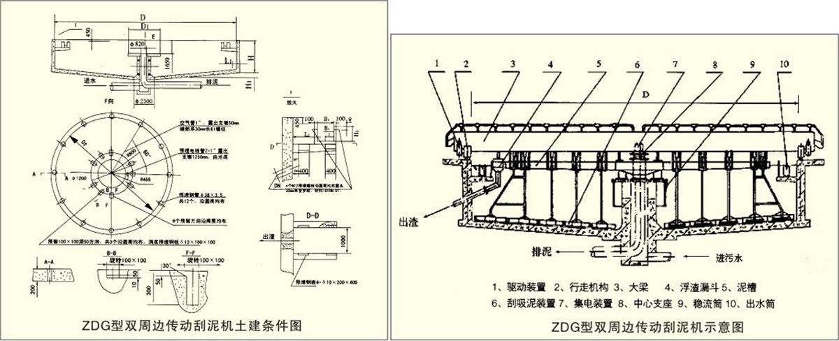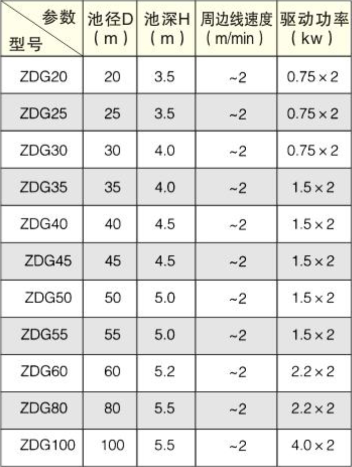 本機型為雙周邊驅動,中心支墩式,上部設有浮渣收集裝置,采用中心配水,利用液位差自吸式排泥,適宜的直徑范圍大于18米。